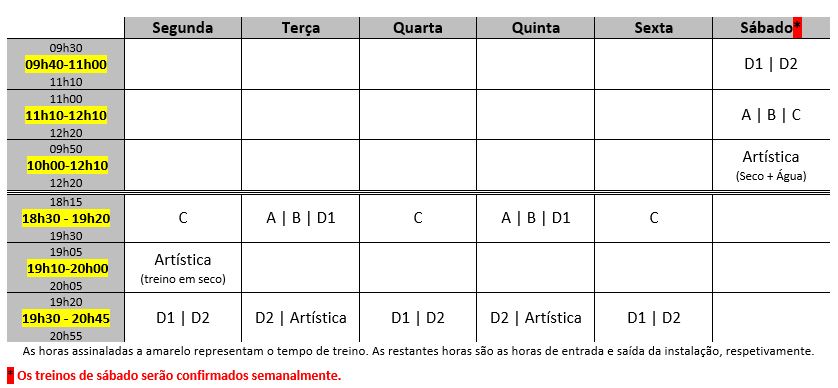 Para o escalão de Masters, os horários de treinos serão às segundas, quartas e sextas, entre as 10h00 e as 13h00 e entre as 15h30 e as 18h30, com a marcação prévia de um bloco de hora.